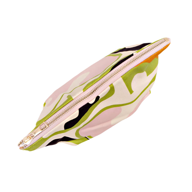 Pencil case or cosmetic pouch? You decide! This is perfect for either, it's made lovely cotton canvas fabric and has nylon lining. Features an abstract print and a contrast colour brass metal zip. Measures 26cms wide at the top, 13cms height and 9.5cms wide at the base. Machine washable as well, so it's easy to look after. Made in the UK.