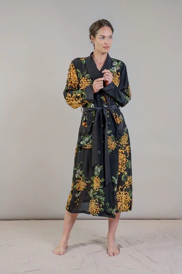 This design falls to an elegant long length and features a fold over collar, complete with self-tie waist belt and front patch pockets. This gown is perfect as a luxurious house coat or for layering as a chic accessory to your favourite outfit.