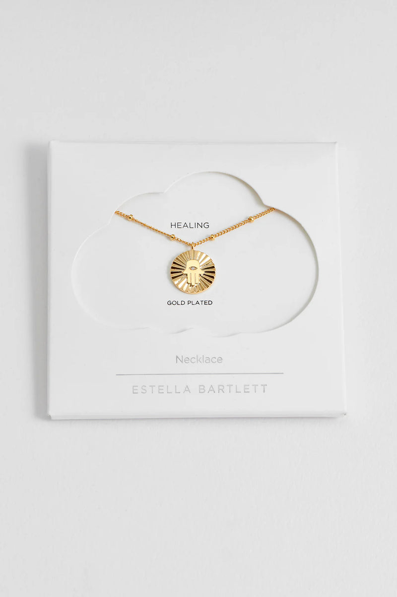 The Hamsa Hand Coin Necklace features a detailed Hamsa charm on a textured coin pendant.