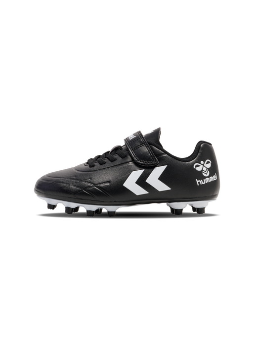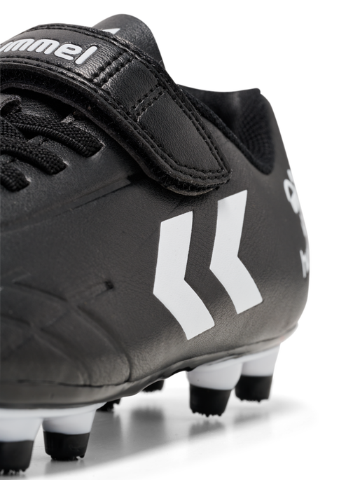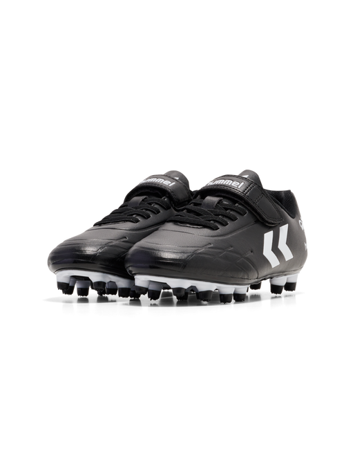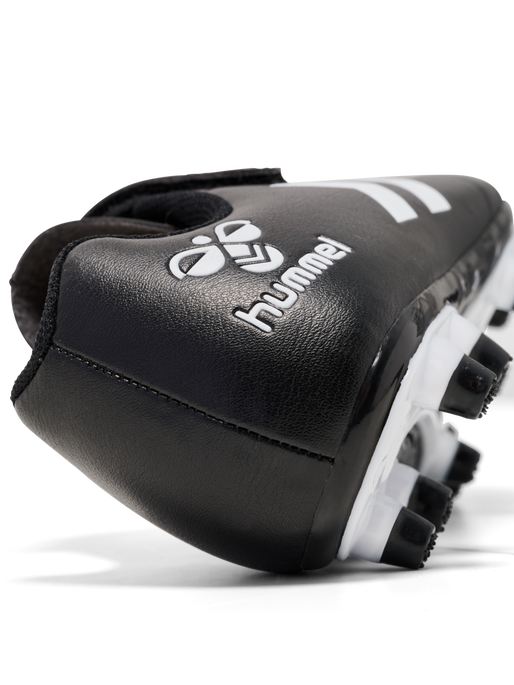 Football boot for firm ground purpose. A soft PU upper with elastic laces and velcro closure, soft mesh lining and die cut insock. Deboss and print details on upper. Inspired by hummel's proud history of football boots.