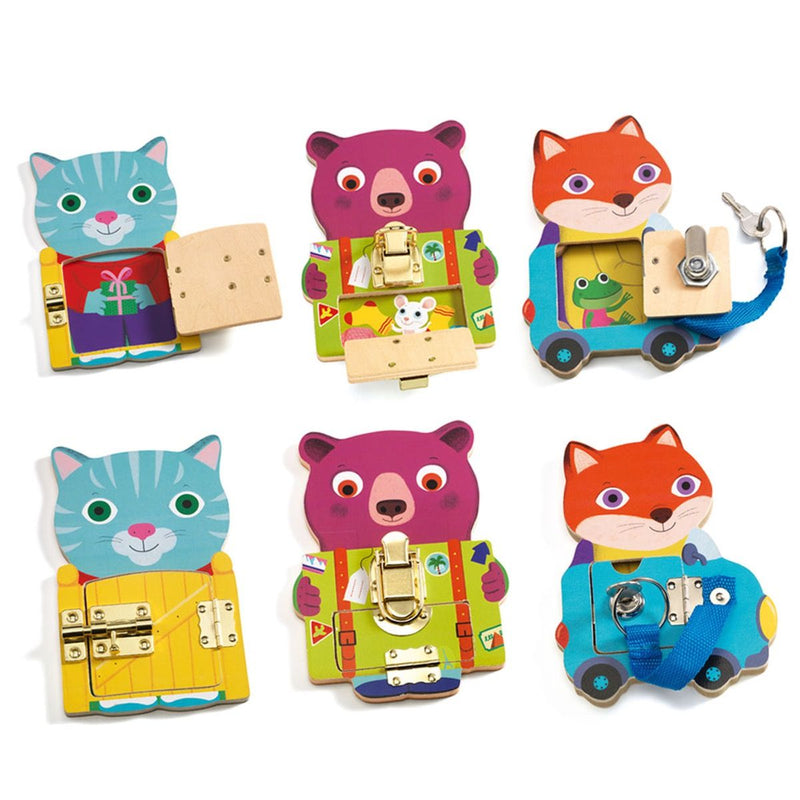 This set of 3 wooden animals help teach children how to use the lock, latch and bolt.