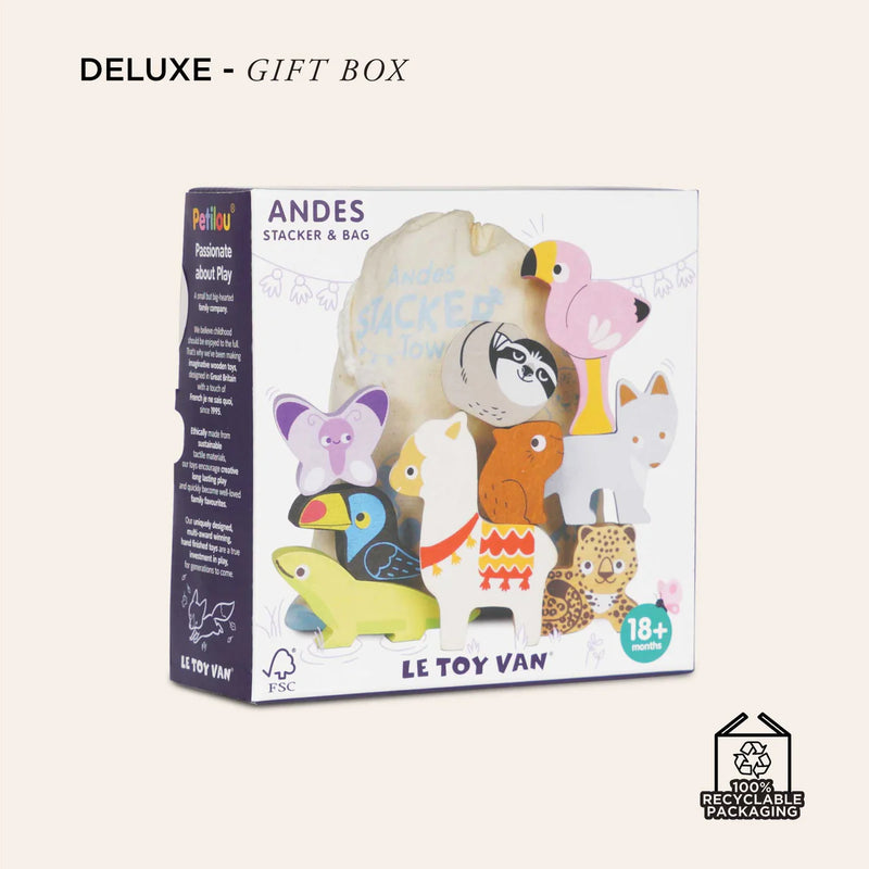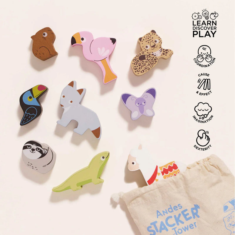 Stack them up until they tumble down. Andes Stacking Tower is made up of a collection of 8 wooden mountain animals, and a little ‘Snowy Mountain’, scaled for toddler hands. It includes a handmade fabric draw string bag. Perfectly portable, play with them anywhere and everywhere!