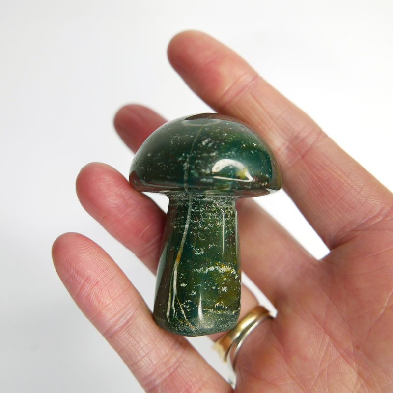 Bloodstone Gua Sha Mushroom Designed to gently follow the natural planes of your face, our gua shroom glides softly across skin to ease tension, de-puff, and invigorate circulation. This mushroom is hand-carved from rich, deep green bloodstone - a protective, strengthening stone valued for its ability to ground, balance and energise. Each piece is a small, sculptural gem, made from stone formed by nature over millions of years. Small red and black inclusions and occasional quartz formations make every mushroom a unique piece of earthly artistry. Gua sha massage helps drain excess fluids, ease tension, and boost circulation - reducing puffiness, lifting contours, and invigorating your natural glow.