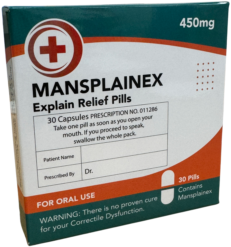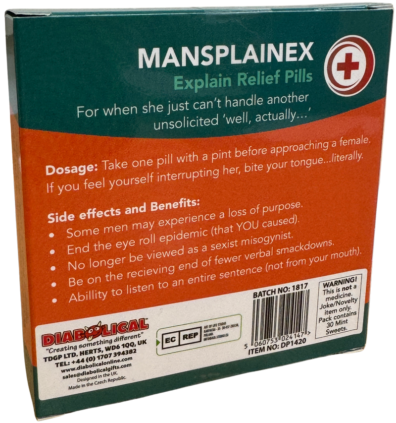 Finally — a cure for chronic over-explaining! Mansplainex is the hilarious novelty pill box that every know-it-all desperately needs. Packed with “Explain Relief Pills,” this witty prescription-style box offers fast-acting humour for anyone who just can’t resist starting a sentence with “Well, actually…” Inside, you’ll find blister packs filled with refreshing mints — because fresher breath makes unsolicited opinions slightly more bearable. Designed to look like genuine medication, Mansplainex is the perfect tongue-in-cheek gift for colleagues, partners, or that one friend who thinks they know everything. Ideal for Secret Santa, birthdays, or as a bestseller in any novelty or gag gift range, it’s guaranteed to get laughs and spark conversations. Warning: May cause reduced lecture time, increased listening skills, and temporary silence in men who’ve finally realised… she already knew that.
