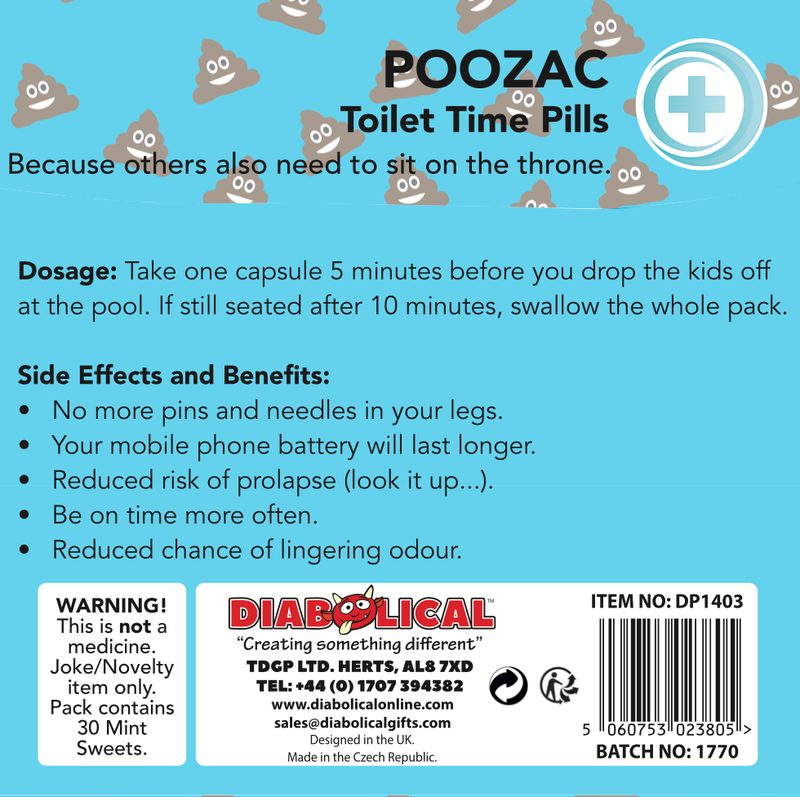 Poozac is the perfect novelty gift for those who spend a little too much time on the toilet. This cheeky prescription-style mint pill box is designed to offer a humorous remedy for anyone who enjoys a bit too much relaxation in the loo. Packed with refreshing mints, Poozac is the ideal gift for those who need to take their toilet breaks a little more seriously—or at least have a laugh about it.