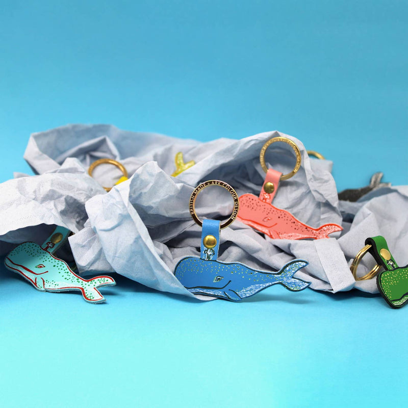100% Genuine Leather Keyring | Made in the United Kingdom | Gold plated Ring A happy whale for your keys. Designed in a fun combination of colours, from bold pink to classic grey. One of our longest standing designs, these key chains compliment our whale bookmarks perfectly to create a nautical theme this summer. Genuine leather keychain with gold plated ring. Made using the traditional technique of hot foil embossing which ensures a handmade and unique product every time. Embossed and assembled in Scotland. Designed and dispatched from our Cambridge studio. British made. Length 9cm