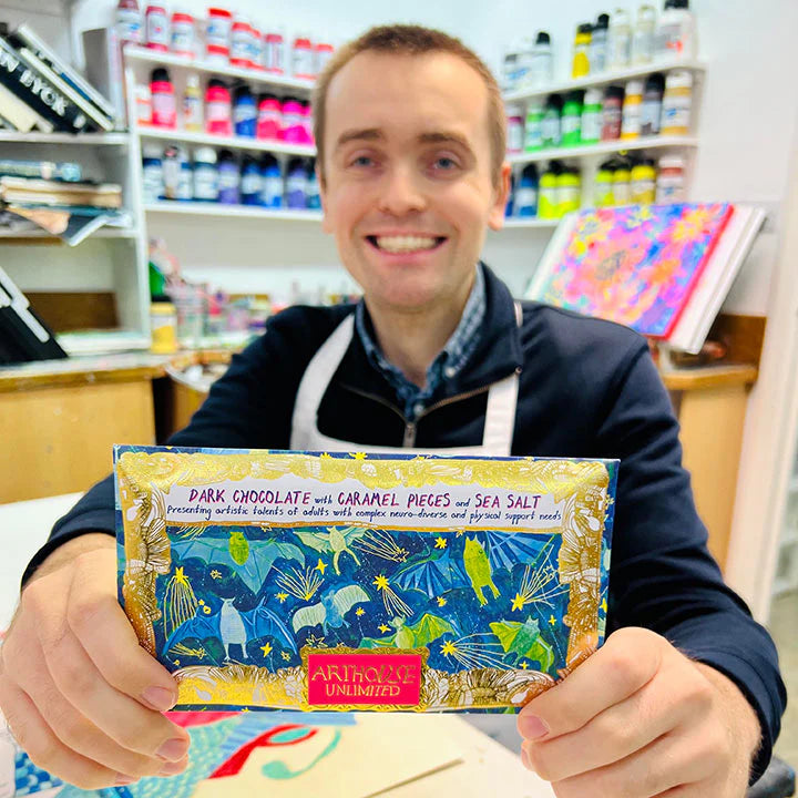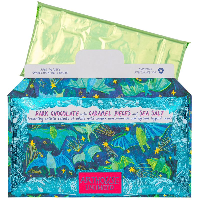 This luxurious dark chocolate bar with caramel & sea salt is made in the UK with responsibly sourced single origin cocoa. Wrapped in coloured foil & encased in a recyclable envelope, this bar features the ARTHOUSE Unlimited artists original Bat Mates artwork presented in a shimmering turquoise frame. An ideal gift for chocoholics, art lovers & good-cause supporters everywhere!