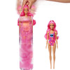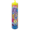 The packaging is part of the fun -- pull the strip to remove the outer layer and reveal a clear tube. Inside is a Colour Reveal Barbie doll, whose full look is hidden behind a neon tie-dye coating, and four bags with surprises. Remove everything and fill the tube with warm water, then insert the doll and swirl around.