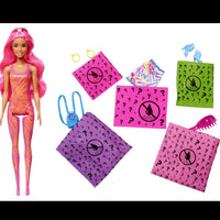 Contains: 1x Assorted Barbie Colour Reveal doll with colour-change eyebrows and lips and 4 bags containing 1 skirt, 1 pair of earrings, 1 pair of shoes and colour-change purse