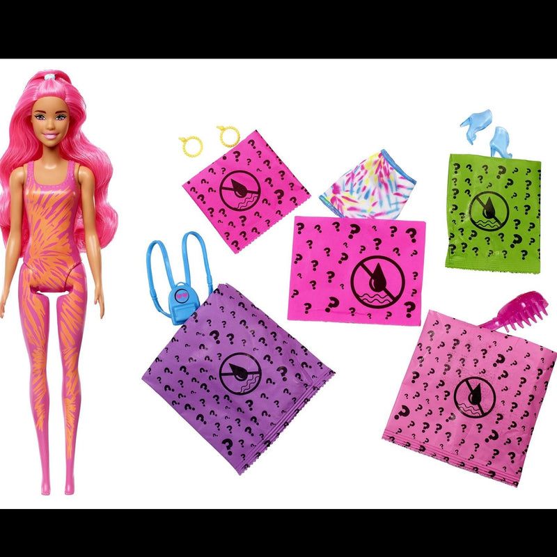 Barbie Colour Reveal dolls deliver an unboxing experience full of surprises -- seven of them! A doll with a neon bright tie-dye dance outfit is guaranteed, but each one's neon look remains a mystery until revealed.