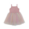 A soft cotton body with a simple tulle skirt in a rainbow colour.