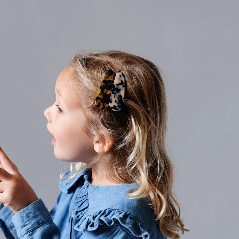 These super cool tortoiseshell resin clips come in a pack of two and look amazing for sweeping back stray hairs, or holding up a 'do. Coming in a pale brown and a dark brown tortoiseshell, these would look amazing worn together or individually. With a large strong clip these are great for thicker hair, and would even work in adult's hair in case you fancy borrowing! Best of all, these clips are made from cellulose acetate, an environmentally friendly material that is derived from natural cotton and wood fibres.