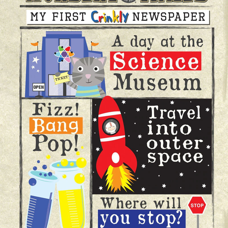 Nursery Times Crinkly Newspaper. A Day at the Science Museum. 6 pages of illustrations exploring the science and the planetarium with rhyming text. Dimensions approx:  30cm x 20cm. CE tested and machine washable. A practical, lightweight cloth book with crinkly pages. A great sensory toy. A unique gift. Each newspaper is packed in a gifting envelope to add 'To' and 'From' and a short message.