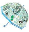 Cute Djeco umbrella in transparent, soft plastic with print of green leaves and fine birds. The shaft and edges are dusty blue.