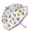 Beautiful Djeco umbrella in transparent, soft plastic with prints of rainbows, clouds and fairies and with a purple handle.