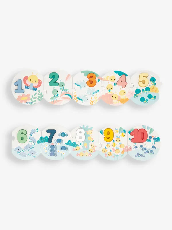 Learn to count with the animals! Each puzzle piece corresponds to a wooden number. Simply count the animals and find the associated number to complete the puzzle. Your child will learn while having fun! A template is provided to help little ones. Ideal for developing fine motor skills.
