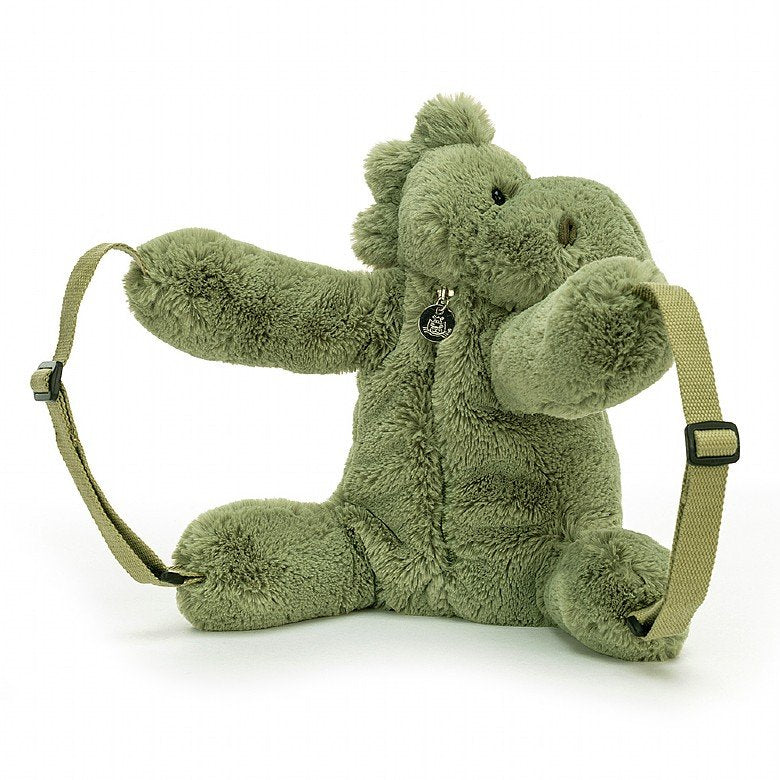 Huggady Dino Backpack is a time-traveller's very best friend! This podgy green pal has strokeable spines, a tickly tail and a zip-up tummy - great for storing tasty leaves! With sage webbed straps for dino safety, this rucksack's essential for any rampage!