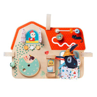 This wooden panel in the form of a farm is teeming with activities and materials to stimulate the little ones in their discoveries. The fine illustrations tell the story of farm animals. Easy to attach to the playpen with the velcro fasteners.