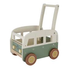 And off you go! On adventure throughout the living room with this Vintage walker wagon. Step by step you learn how to walk, and this push wagon will help you get there. So start your engine and imagine being the driver of this supercool van. The wooden Vintage walker wagon is not just a helper to watch your beginner walker flourish. The timeless design of a vintage surfer van is also the perfect toy box for your baby. Your little one can store toys for imaginative play indoors or bring them with on walking adventures! Great for development of balance, coordination and motor skills. And thanks to the rubber strips you will not have to worry about your floor when your child is cruising through the room