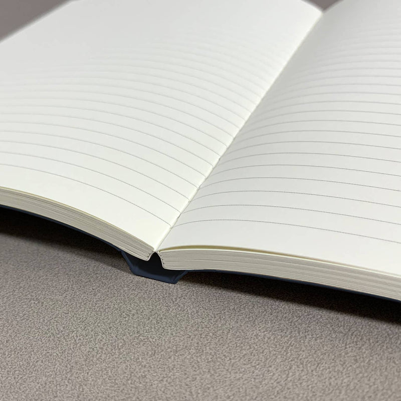 Simple and elegant, this navy linen notebook is a premium journal filled with luxurious lined paper ready for sketches, scrawls and fountain pen journal entries. The 128 Munken ivory lined pages of the A6 softcover notebook are connected using specialist binding that allows the notebooks to lay flat, further adding to the premium writing experience.