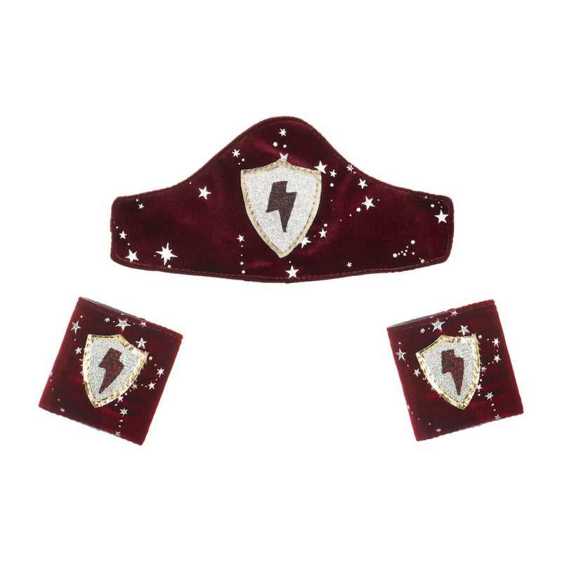 Get ready to save the day with this awesome enchanted velvet super hero set! A super soft burgundy velvet hat embellished with constellations of silver stars complete with a glitter lightning bolt shield is teamed with two super cute wrist cuffs in a matching design. With soft grey satin fabric to the reverse, elasticated headband and velcro fastening to the cuffs, your little hero will be ready to jump straight into action! Team with our enchanted velvet cape for full superhero getup!