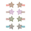 Make them the star of the party with these super sparkly star clips! With 8 in a pack, these glittery stars come attached to 30mm grosgrain ribbon covered alligator clips in contrasting colours of aqua, dusky pink, coral and taupe and come in the loveliest combination of lilac, gold, pale green and irridescent glitters. Wear them in pairs, on their own or even all together! Great for younger kids with finer hair.