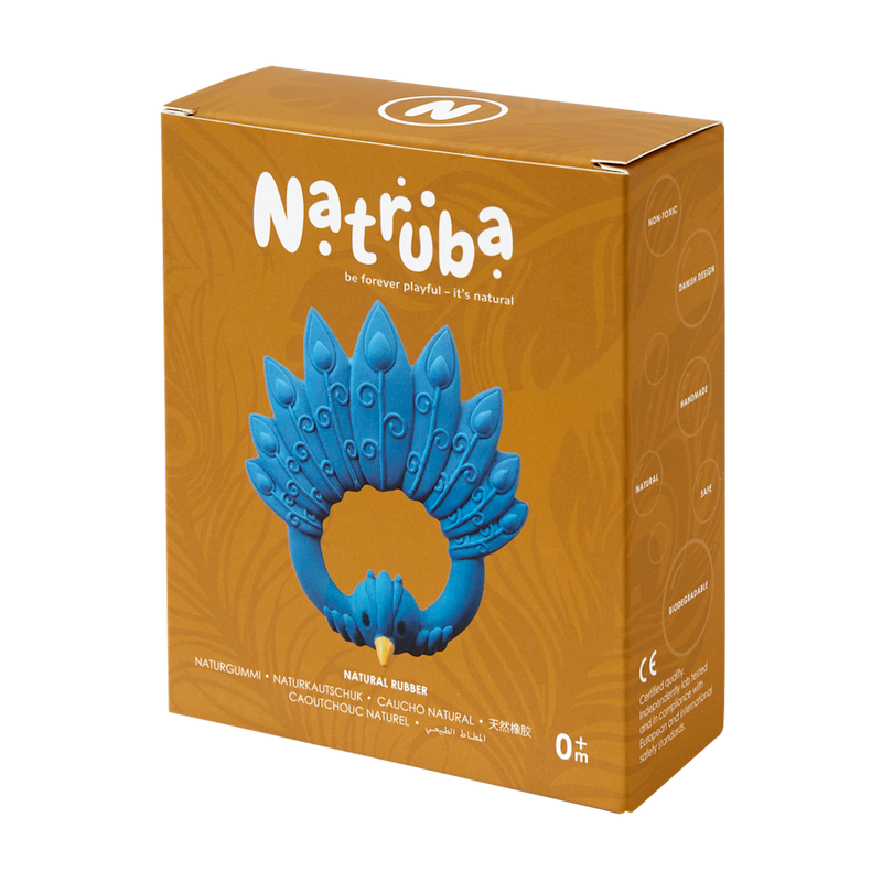 The beautiful and graceful peacock is now a stunning baby teether. The Natruba peacock is easy to grip for small hands with different surfaces to encourage sensory play and the soft natural rubber easily satisfies all stages of sore gums. Teething just got so beautiful!