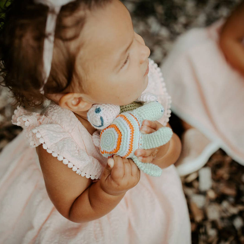 Pebble toys are beautifully handcrafted by HathayBunano, a non-profit fair-trade organization in Bangladesh. Meaning "handmade" or "hand-knitted" in Bangla, HathayBunano empowers disadvantaged rural women with fairly paid, flexible employment, helping them achieve financial independence. All Pebble toys are made from natural materials, ensuring a soft and safe experience for little ones, with subtle variations in size, color, and design. Featuring a 100% organic cotton exterior and a 100% polyester fill, they are soft, safe, and ideal perfect for babies from birth. Designed for newborns and young children cuddling, grasping, and sensory play. The soft texture and adorable designs make them comforting companions for little hands. They are also easy to care for, being machine washable at 40°C and tumble dry able on a low setting, ensuring they remain fresh and ready for everyday use. By purchasing a Pebble toy, you’re not just getting a beautifully made product—you’re also supporting rural women in Bangladesh and creating a positive social impact.