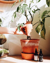 Ollas (or Oyas) is a traditional, natural way to save water, save time and grow better plants. Bury into the soil, fill with water and watch your plants thrive! It's a porous terracotta pot you bury in your planter and you fill with water. Moisture will seeps out slowly through the walls to water your plants right at the roots. Over time the roots attach themselves to the outside of the Olla and draw water out as they need it. Your plant will take just what she needs—no more, no less. Easy!