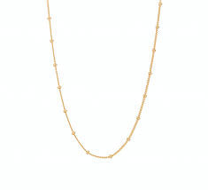 The Solar necklace features small gold beads on a chain, and works as a subtle piece over a roundneck knit or layered with longer pieces.