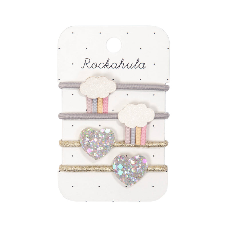 Rainy days can be fun days, with these glittery rainbow clouds! Two little white clouds with pastel rainbow rain, and two shimmering pastel glitter hearts, each set onto an elastic pony.