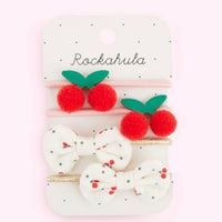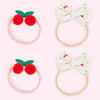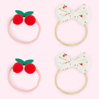 Stay sweet with this four pack of cherry ponies! Fun pom pom cherries with detailed green stems adorn two pink elastics, whilst two cute hand tied bows in our sweet cherry stripe print fabric adorn the other two.