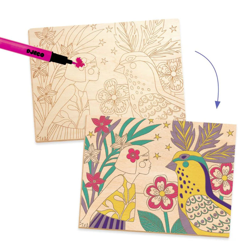 An original colouring activity on wooden panels. Use your brush marker to follow the artist’s step-by-step instructions and colour in the poetic illustrations. Handy grooves in the design guide the ink and prevent the colours from mixing!