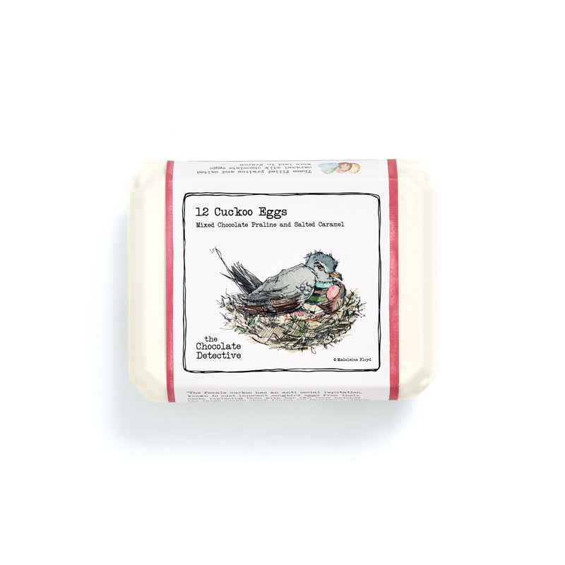 These are the most charming chocolate eggs you will find, and a perfectly indulgent gift for someone special! A beautifully illustrated box filled with a dozen delicious "Cuckoo" chocolate eggs, made in France with either a delicate hazelnut praline or a salted caramel ganache, and Ecuadorian origin chocolate.