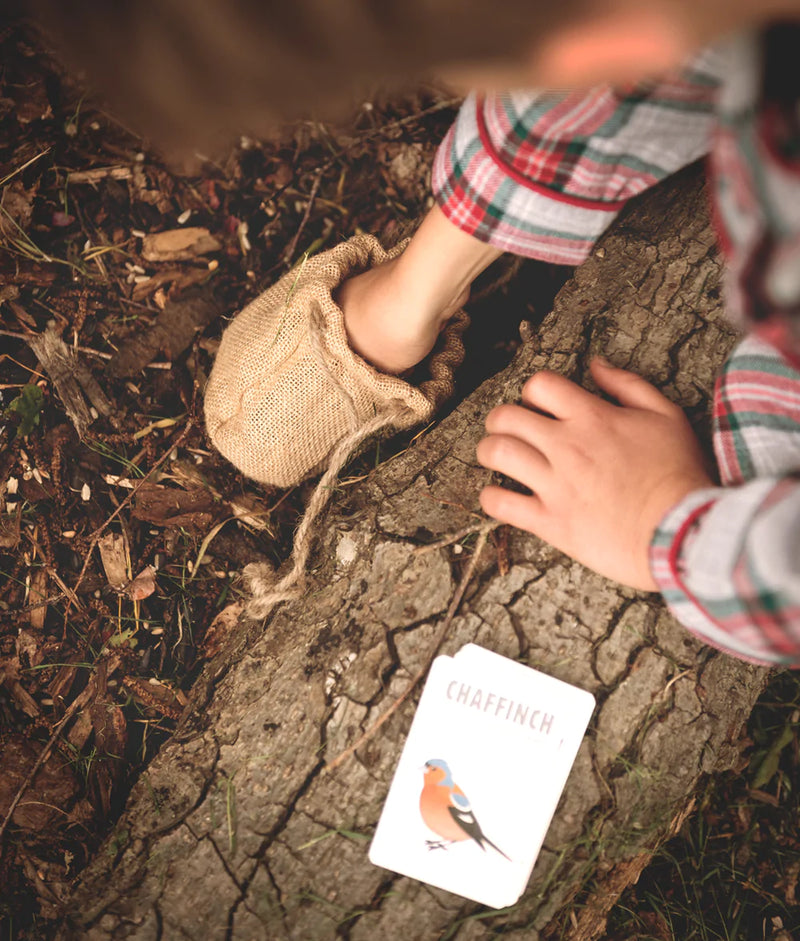 • A pack of 9 beautifully illustrated British native bird identification and information cards designed by us and contained within a cotton pouch for safe keeping.